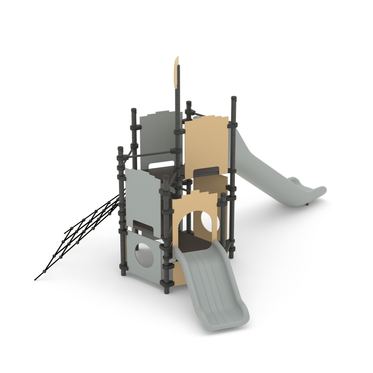 Игровой комплекс для тематических игр и физического развития предназначен для детей в возрасте от 4 лет. Изделие представляет собой сборно-разборную каркасную конструкцию из металлических труб, установленную на забетонированные стойки.