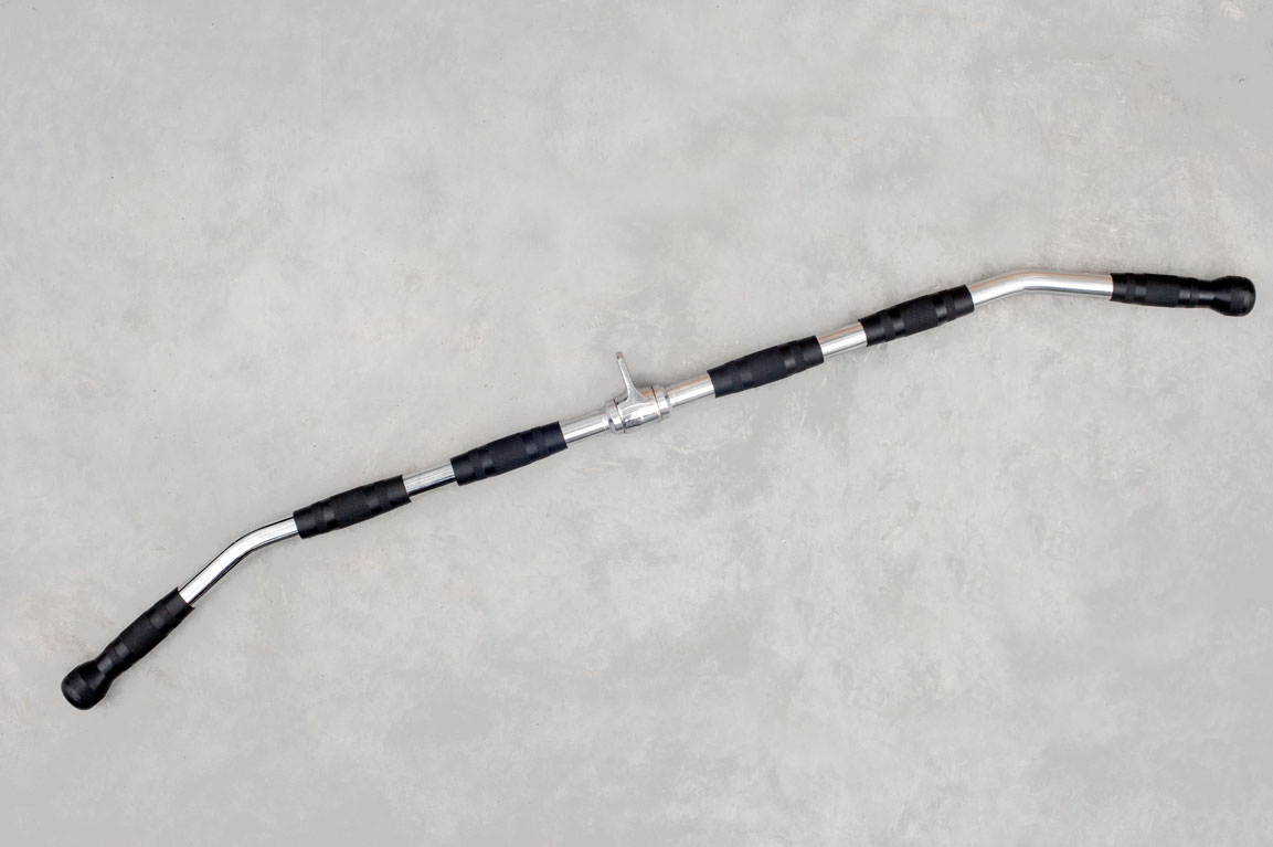 Рукоятка для вертикальной тяги за голову длиной 122 см имеет несколько вариантов хвата (широкий хват, средний хват и узкий хват). Совместима с любым грузоблочным тренажером. Изготовлена из стали и покрыта износостойким зеркальным хромом. В местах хвата расположена резиновая ручка с противоскользящим рифлением.