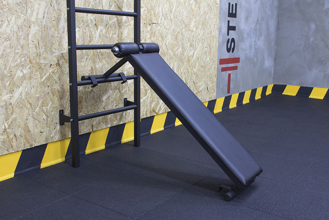 Конструкция тренажера изготавливается из толстостенной стальной трубы. Поверхность окрашивается износостойкой порошковой краской черного цвета и запекается при высокой температуре в полимеризационной печи. Доска и валики для подколенных сгибов обшиты винилискожей. Имеются нескользящие напольные упоры. Занимает минимум времени на установку - снимается и надевается в одно движение. Надежно фиксируется к шведской стенке и регулируется по высоте.