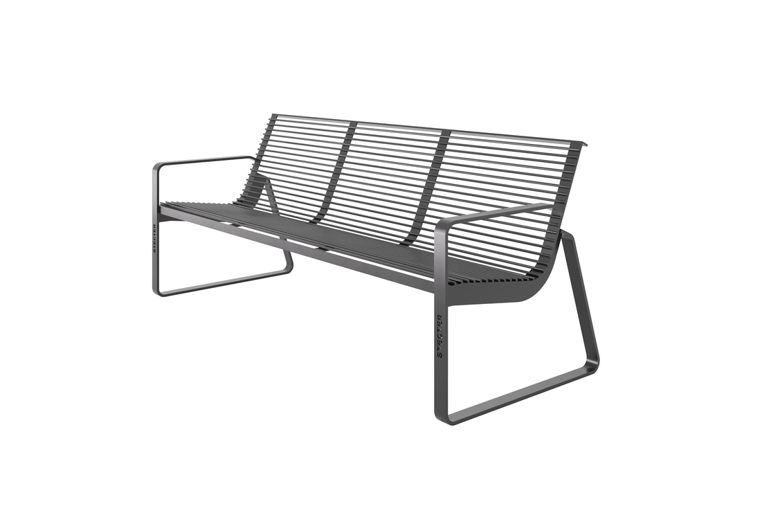 Уличная скамейка “Стения” изящная и удобная - есть спинка, подлокотники. Металлический каркас окрашивается порошковой краской. Далее, покрывается средствами для защиты от коррозии и сохранения внешнего вида.