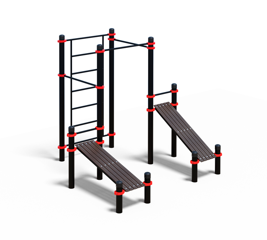 • две лавки для пресса с уклоном. Угол наклона легко регулируется во время монтажа, что позволяет усложнять выполнение упражнений.
