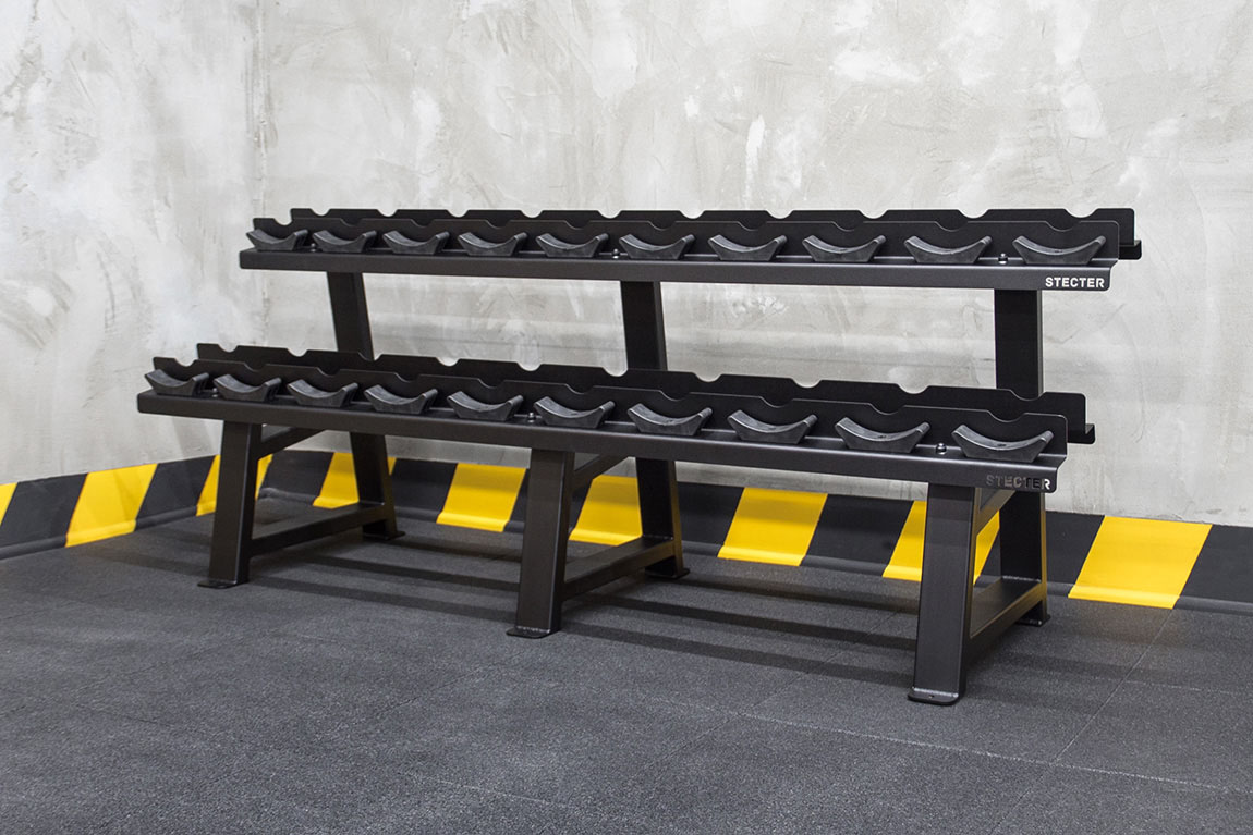 Позволяет удобно хранить и пользоваться гантельным рядом из 10 пар. Каждый уровень гантельной стойки вмещает по 5 пар гантелей. Форма ложементов предназначена для гантелей с утяжелителями в форме круга.