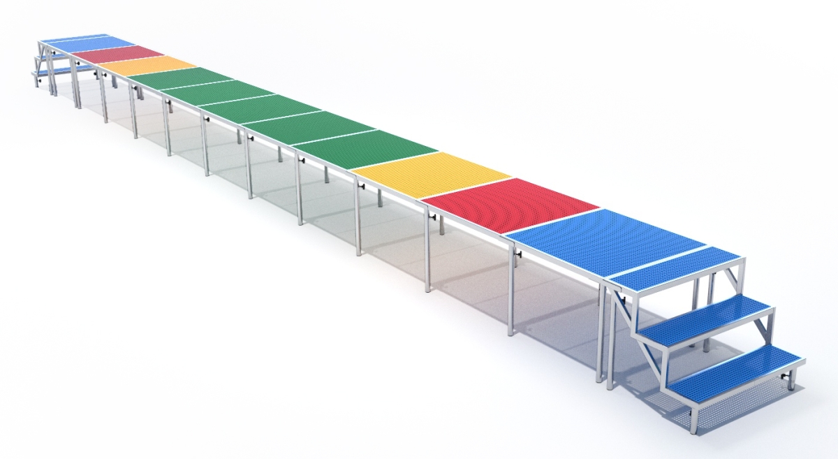 Общий комплект поставки составляет 74 цветных модуля размером (ДхШхВ) - 1000х1000х700 мм и 6 лестничных модулей. Цвета модулей: 14 - синих, 8 - красных, 12 - желтых, 40 - зеленых модулей. Таким образом, Вы сможете собрать 2 помоста состоящие из 32 модулей и 1 помост состоящий из 10 модулей. Каждый оборудован лестницами с торцевых сторон помостов.
