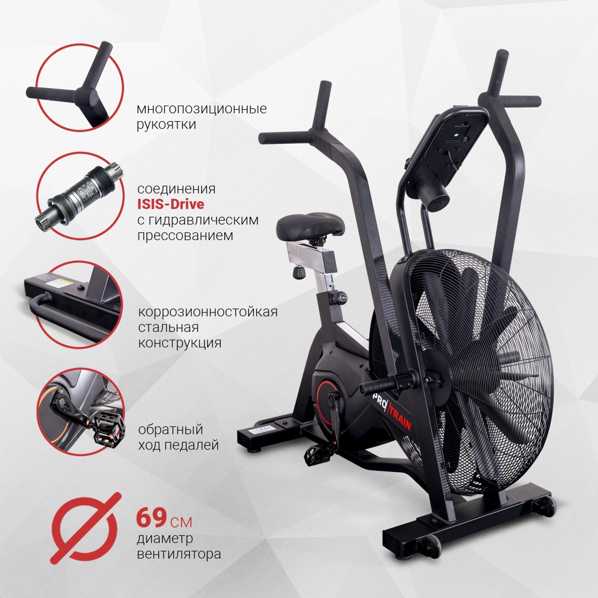 Велотренажер Protrain ProBike-005 — эффективный кардиотренажер для HIIT тренировки всего тела. Бесконечное сопротивление: чем интенсивнее усилия спортсмена, тем выше аэродинамическая нагрузка. Многопозиционные рукоятки для изменения хвата и смещения нагрузки. Руки и плечевой пояс можно прорабатывать вместе или раздельно.Область применения: профессиональная;Система нагрузки: аэродинамическая;Количество уровней нагрузки: неограниченное количество уровней сопротивления;Максимальный вес пользователя: 135 кг; Консоль/дисплей: LCD-дисплей;Программы и функции: 9 шт.; Размеры товара в сборе: 128 х 27 х 89 см.