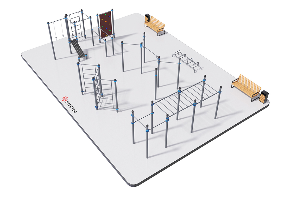 Типовой проект воркаут площадки № 4 объединяет в себе зону для занятий различными спортивными направлениями на улице (силовая подготовка, гимнастика, скалодром), а так же удобные места для отдыха.