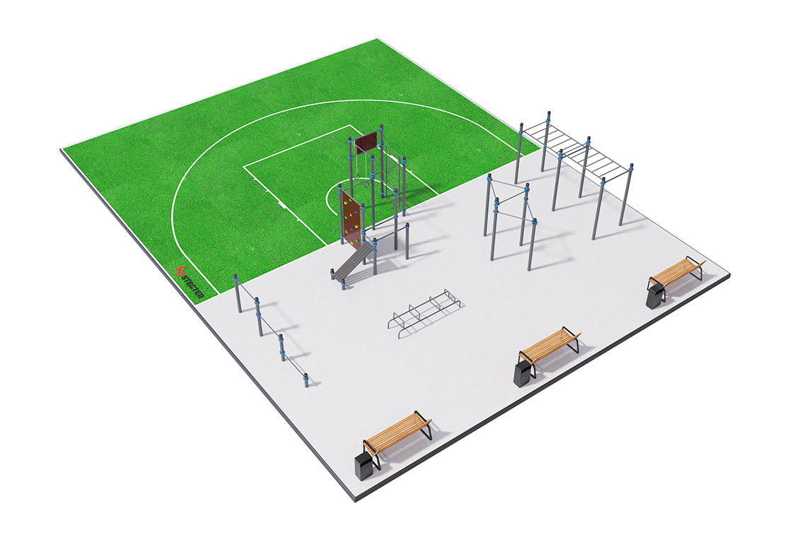 Типовой проект воркаут площадки № 5 объединяет в себе зону для занятий различными спортивными направлениями на улице (силовая подготовка, гимнастика, баскетбол), а так же удобные места для отдыха.