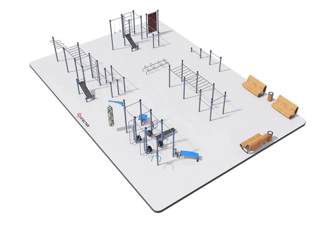Типовой проект воркаут площадки № 6 объединяет в себе зону для занятий различными спортивными направлениями на улице (силовая подготовка, гимнастика, бокс, скалодром, баскетбол), а так же удобные места для отдыха.