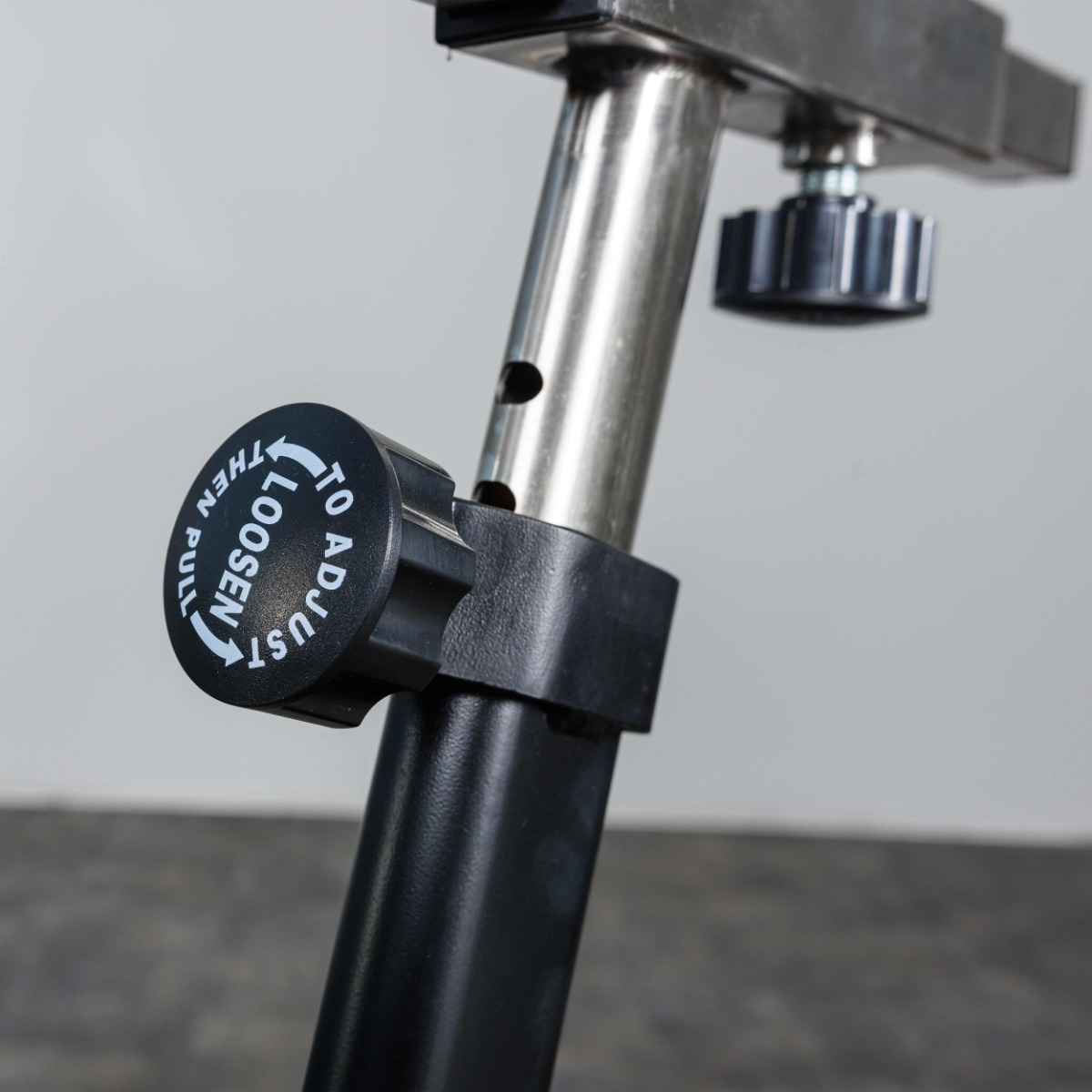 Подпятники для стоп с прорезиненным покрытием, установленные на рукоятках в районе ветилятора, позволяют зафиксировать ноги при выполнении тренировки только руками.